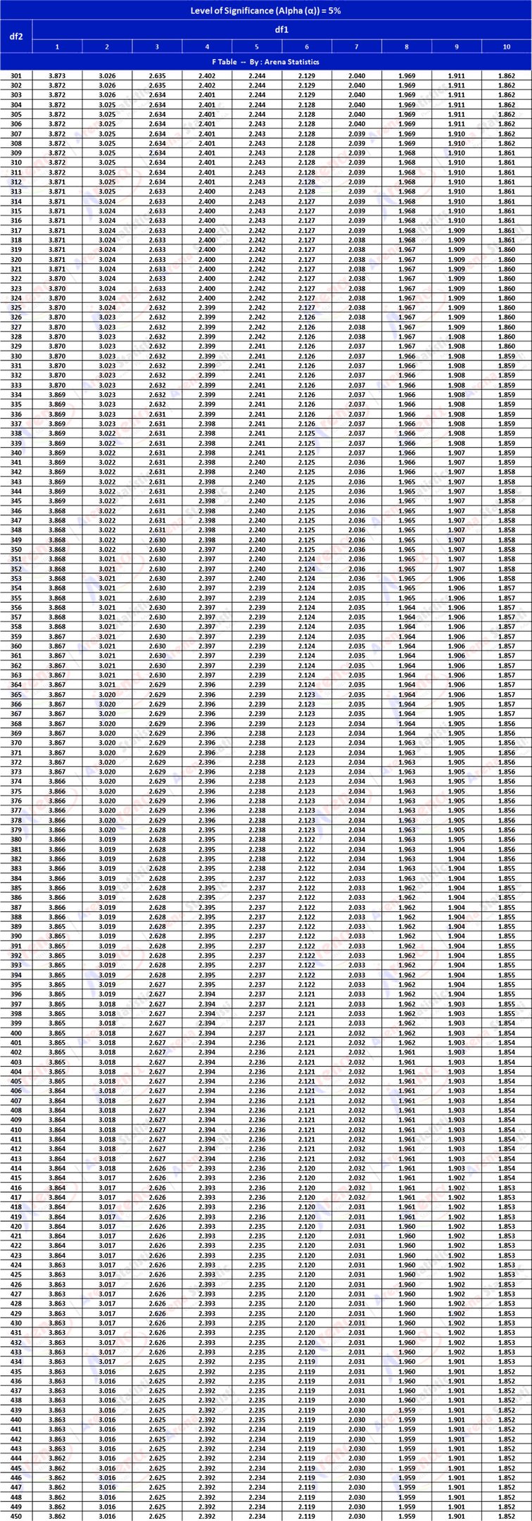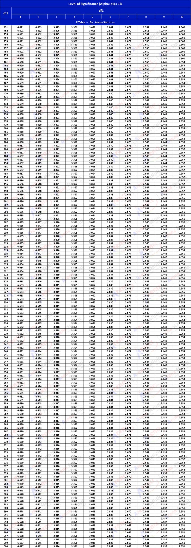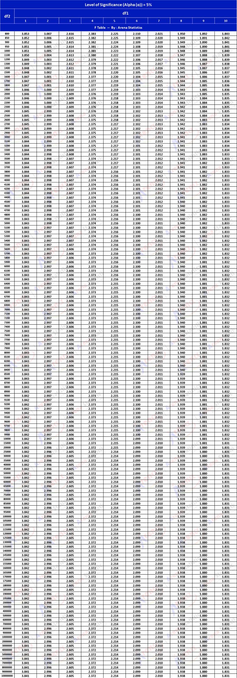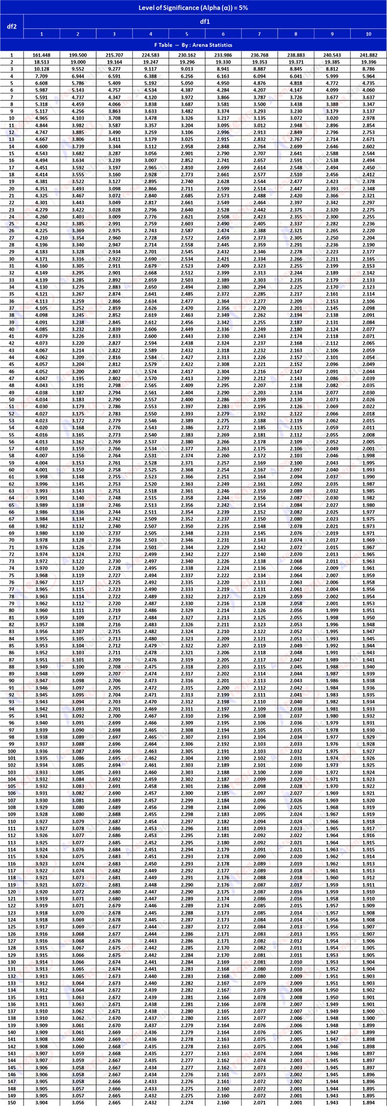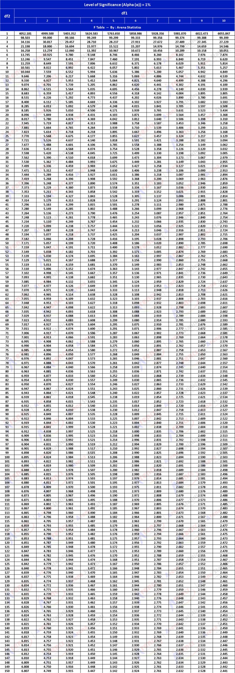 Untuk mendapatkan nilai F tabel secara manual, peneliti dapat menggunakan F tabel berikut