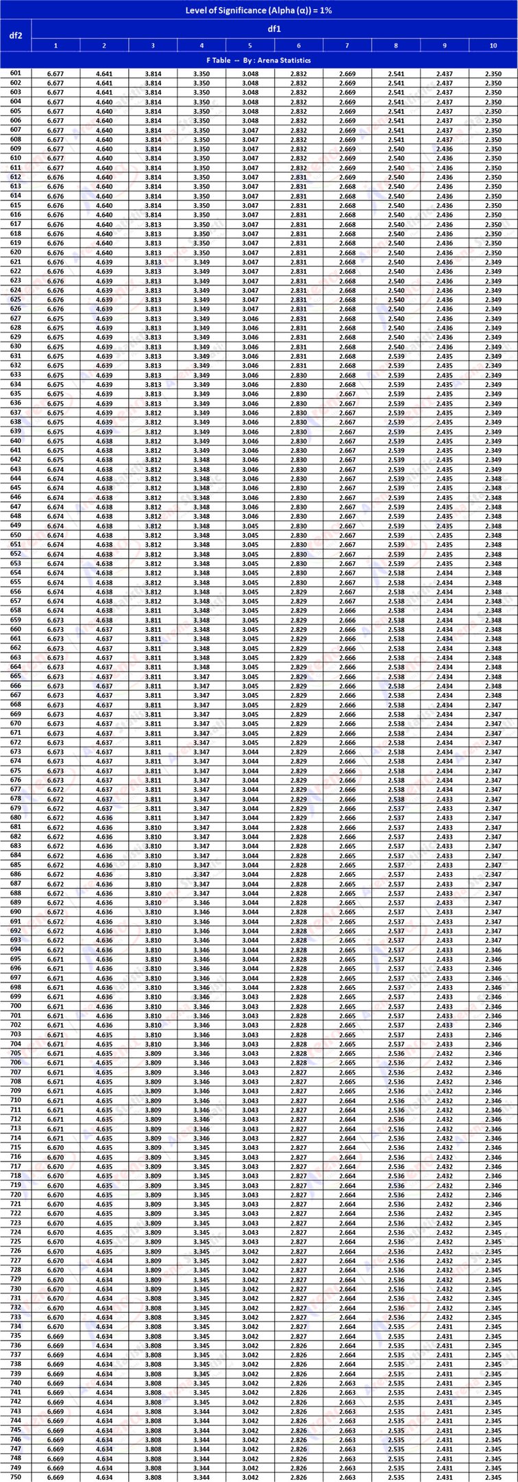 F Tabel dengan Alpha 1% dan Degree of Freedom 2 (df2) 601 - 750