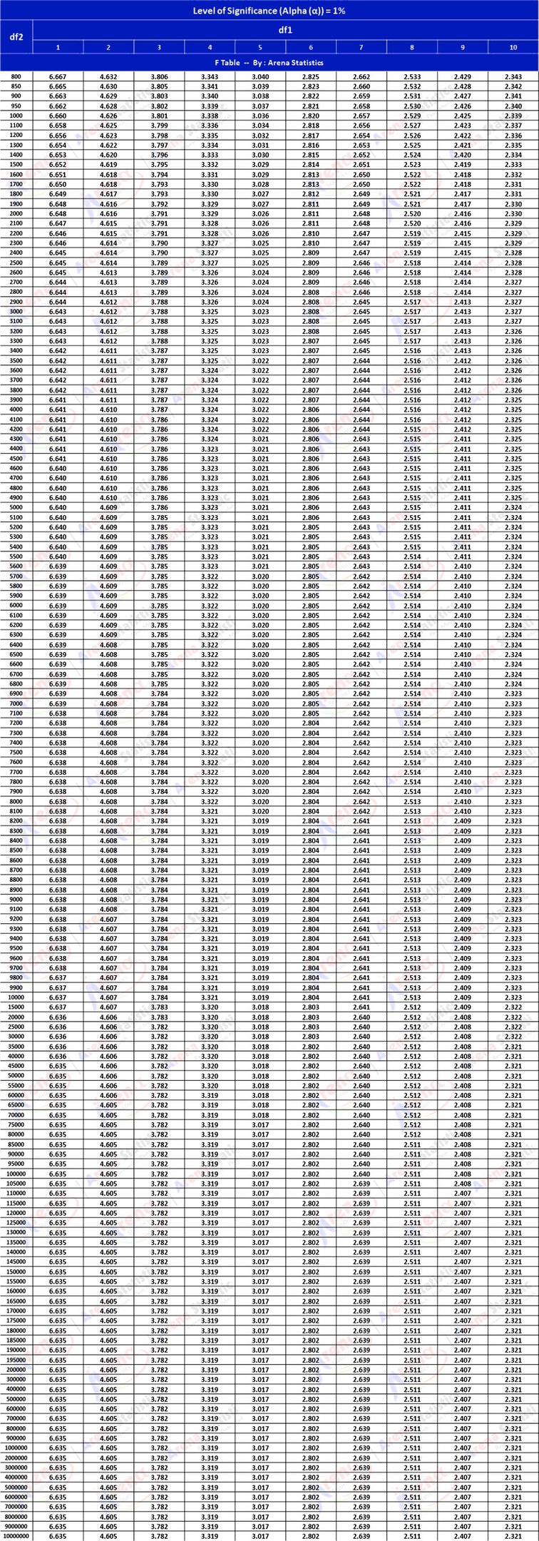 F Tabel dengan Alpha 1% dan Degree of Freedom 2 (df2) 800 - Infinity