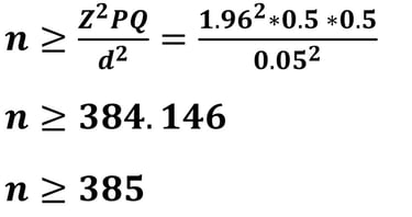 Alasan 2. Kembali pada Teorema Limit Pusat (Central Limit Theorem) bahwa semakin besar ukuran sampel maka semakin representatif atau semakin mendekati normal, sehingga apabila peneliti membulatkan kebawah maka sampel menjadi 384 sehingga diperoleh d sebesar 5.03%, sedangkan apabila peneliti membulatkan keatas maka sampel menjadi 385 sehingga diperoleh d sebesar 4.9945%.