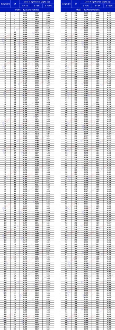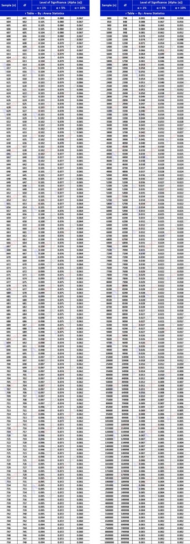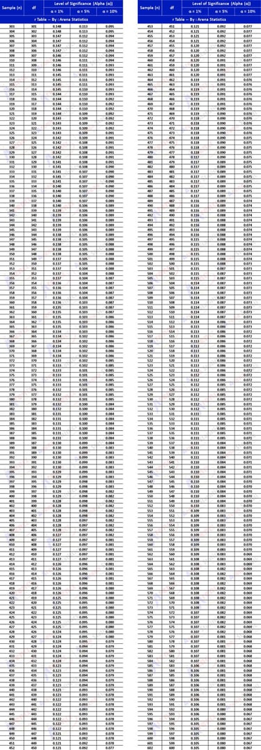 The Pearson's Correlation Table atau r Tabel merupakan pembanding bagi koefisien korelasi pearson (statistik uji r atau r statistic atau peneliti suka menyebut dengan r hitung) pada saat pengambilan keputusan dalam pengujian hipotesis pada analisis Korelasi Pearson