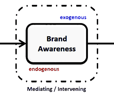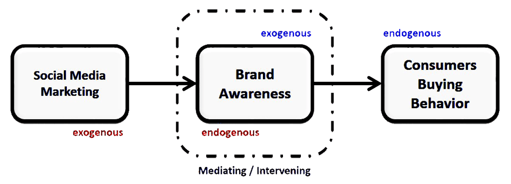 Contoh dari gambar di atas "Pengaruh Social Media Marketing terhadap Consumers Buying Behavior melalui Brand Awareness" berasal dari dua hipotesis pengaruh langsung, diantaranya [H1] Pengaruh Social Media Marketing terhadap Brand Awareness dan [H2] Pengaruh Brand Awareness terhadap Consumers Buying Behavior. Dari hipotesis 1, Brand Awareness berperan sebagai variabel endogen bagi social media marketing (eksogen), sementara hipotesis 2, Brand Awareness berperan sebagai variabel eksogen terhadap Consumers Buying Behavior (endogen). Diperhatikan lebih detail lagi, Brand Awareness memiliki 2 peran, yaitu sebagai variabel eksogen sekaligus sebagai endogen. Dengan demikian Brand Awareness diduga menjadi variabel mediasi (intervening).