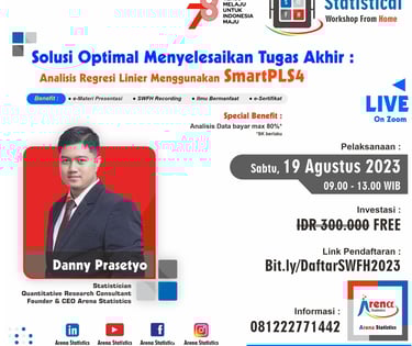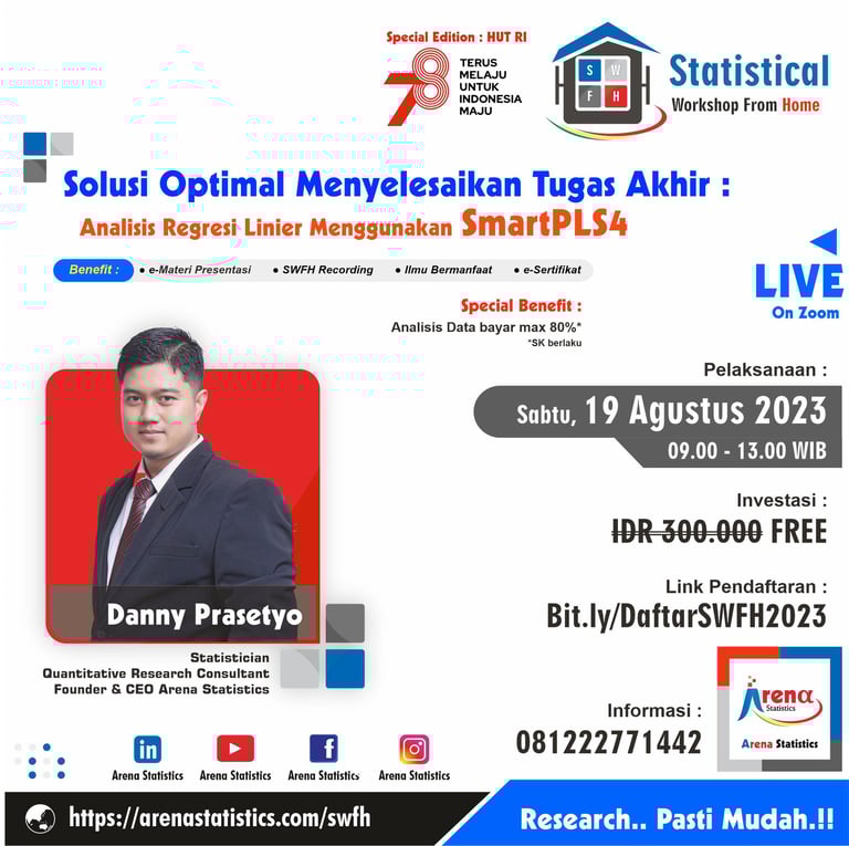 Oleh karena itu, Arena Statistics mengajak Anda untuk memahami konsep dasar regresi linier, dan cara pengolahan data menggunakan SmartPLS 4 beserta cara menginterpretasikan hasil Analisis Regresi Linier dalam Statistical Workshop From Home (SWFH) Arena Statistics 2023.
