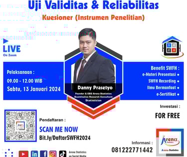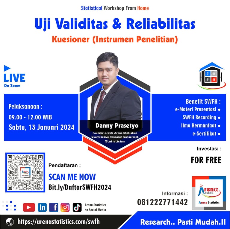 Ikuti Statistical Workshop from Home (SWFH) Arena Statistics untuk memahami pengujian validitas dan reliabilitas kuesioner dan pastikan keterampilan dan pengetahuan Anda bertambah dalam memanajemen instrumen penelitian Anda.